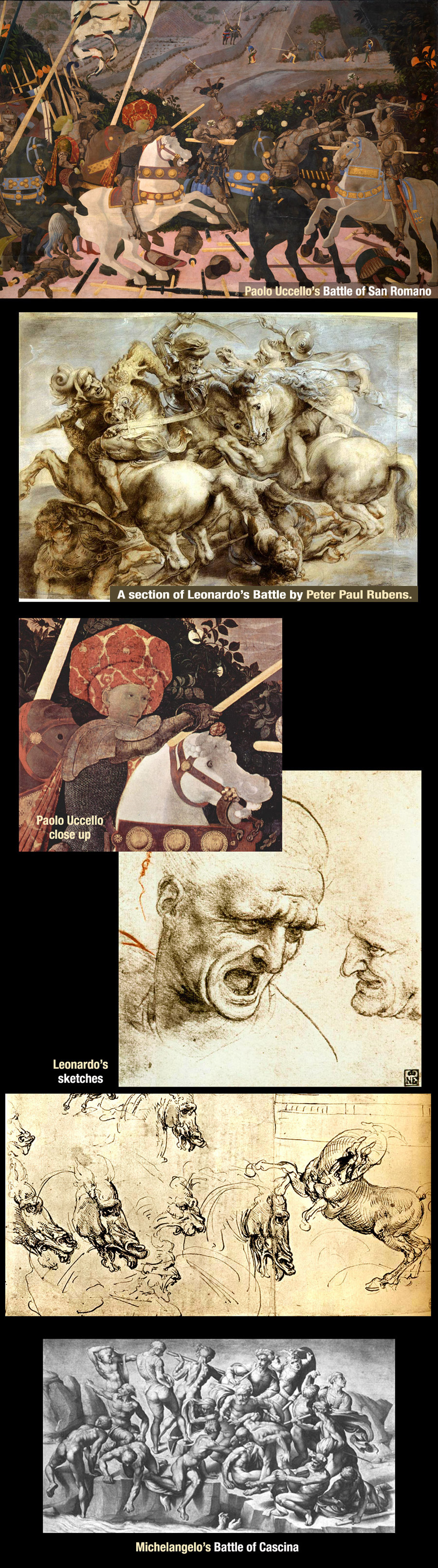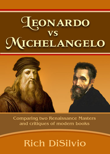 Going a step further, Leonardo's twisted scene, captured by Rubens, is almost abstract, and mingles man with horse in a moving and symbolic fashion that amplifies the animalistic nature of war: man as beast. It was radical, it was raw, it was real, it was the Renaissance. Anyone familiar with Leonardo’s style, as I have been since childhood, knows that Leonardo perfected the art of what I call static vitality. Leonardo's Mona Lisa is simply posed and stationary, yet her body is slightly twisted and the background (with its swirling road and swirling river, let alone her enigmatic smile), brings vitality to an otherwise static portrait. Or Da Vinci’s Last Supper, which could have been a static frontal-view of men gathered at a table, is vitalized by the agitated figures upon hearing Jesus’ words, “One of you shall betray me.” The emotional intensity gives life, action, and profound meaning to the event. Take for example Salvador Dali's Last Supper, where the apostles are all static, drone-like statues. Although a compelling masterwork in its own right, Dali did not capture the deep emotional verismo impact that Leonardo did. Leonardo’s other paintings likewise are generally portraits, yet with subtle and brilliant arrangements that capture the essence of their respective subjects, giving them a unique vitality. Meanwhile, his limited works featuring groups all exhibit subtle but sweeping movements. However, Leonardo’s Battle of Anghiari was something entirely new for Leonardo, but also radically new for the art of painting. It was ferocious, bold, dramatic, and, as always, true to life. And especially true to Renaissance life, capturing the brutal strife of his times more fully and profoundly than Michelangelo, with his nude bathers, set in a composition without a focal point, eschewing the horrors of war and the ferocity that not only made Florence the center of European life in its day but also the bloody, yet extremely creative, heart of the Renaissance. Michelangelo's sketches, judging by the copies, indicated a scene without the intensity of Leonardo's, a composition of nude male bodies, his obsession, that evoked nothing pertinent to the actual battles of Florence or the many that had ravaged Renaissance Italy. Michelangelo’s art, in general, was more often Herculean and dynamic, such as God giving life to Adam in his Sistine ceiling scene, yet he failed to attain the raw hostility of war in this commission. Additionally, and of equal importance, Michelangelo's works featuring groups, such as Battle of the Centaurs or the Last Judgment, were also collages of nude figures, just like his Cascina battleless scene, highlighting his obsession with ancient Roman and Greek nude sculptures and his personal style that he favored over the subject at hand. Ironically, Jonathan Jones and a few other historians credit the Cascina sketch with having the greater influence on succeeding generations of painters. Yet, when we look at the evidence, namely all the great painters who followed Leonardo and Michelangelo into the Baroque and then Mannerist periods, we blatantly see that nude Herculean figures were not the norm, not by a long shot. Here we can see Leonardo's far greater influence with our own eyes and with factual evidence, not the personal opinions of a few historians with a bias. Moreover, Michelangelo's Cascina battle scene gave him the chance to go beyond his normal restraints and venture into new territory, but he did not, he fell back into his safe zone of creating just another collage of nude Greco-Roman sculpted figures. In contrast, Leonardo, whose paintings were often imbued with a subtle hint of graceful or emotional/spiritual movements, was shown here to break new ground, once again, being vigorous and chaotically dynamic, as well as capturing a ferocity that even his young rival never managed to attain, thus proving Leonardo's versatility and ability to adapt to whatever project he set his great mind to. And this commission to create a battle scene shifted Leonardo’s mind to the cold and harsh realities that surround war. Furthermore, being a military engineer, Leonardo certainly knew more about the ugliness of war than Michelangelo. As such, judging from all the remnants, Leonardo was clearly the winner in this competition, as Michelangelo's successes lie elsewhere. Da Vinci's only loss in this battle was that his experimental technique of using oils instead of tempera failed miserably: dripping into a muddy soup of colors as it was heated in a vain attempt to expedite the paint's drying process. Yet, that only sketches of each battle scene survive, we are left with grave disappointment and wonder: what the end results might have looked like? NOTE: This was only an excerpt from the book "Leonardo vs Michelangelo." Rich DiSilvio |